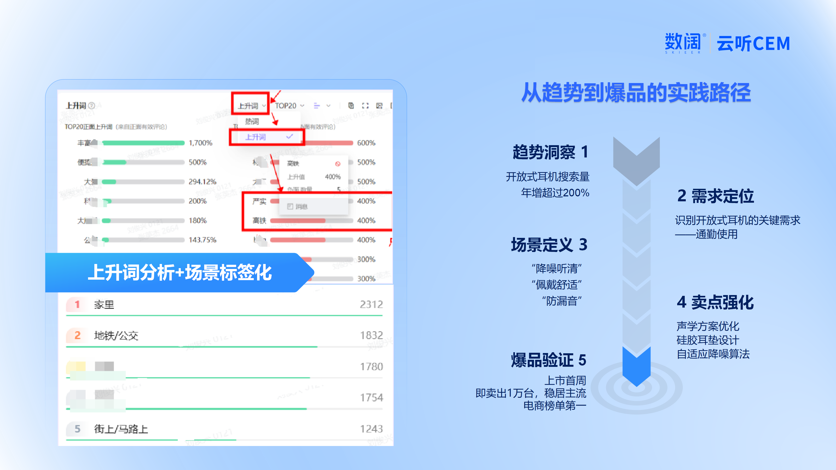 案例:某TWS耳机通过数阔云CEM发现,“通勤场景蓝牙连接不稳定”的上升词占比3个月内从8%涨到23%,且主要提需求的是25-35 岁都市白领。基于此输出定义:“满足通勤场景快速蓝牙连接+防漏音的轻量化耳机”,上市后靠“地铁里1秒连蓝牙”的场景营销,冲上天猫Top1,且因精准定位,营销费用比竞品低20%。