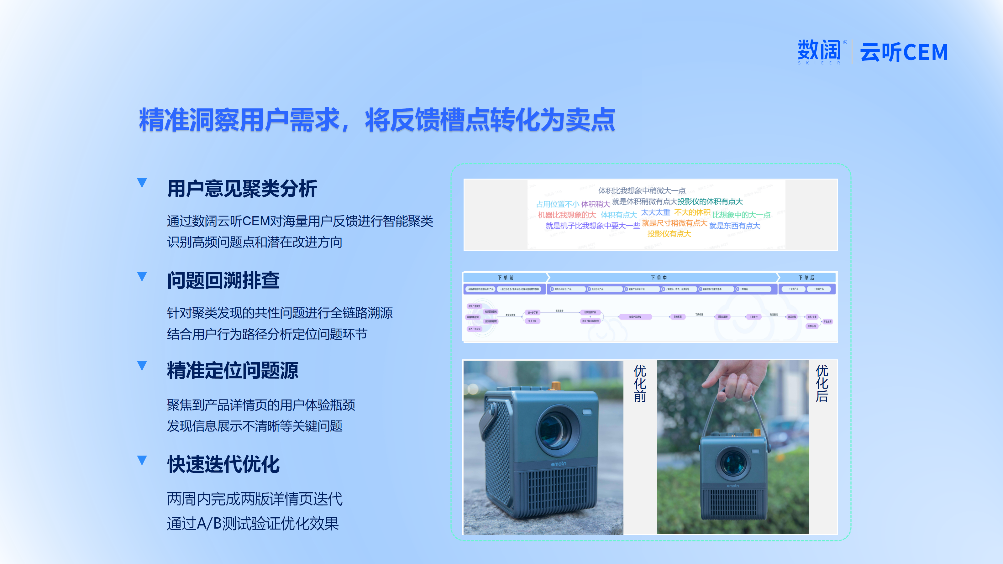 案例:某投影仪品牌新品上市首周,通过数阔云听CEM发现“体积太大”负面声量激增,精准定位到关键问题:产品图示造成消费者尺寸理解偏差,两周内完成两版详情页迭代(室内/户外),通过A/B测试验证优化效果,并在客服话术里强调“比同配置竞品小20%”,3天内CTR(点击转化率)提升18%,问题发现到解决方案上线周期缩短60%。
