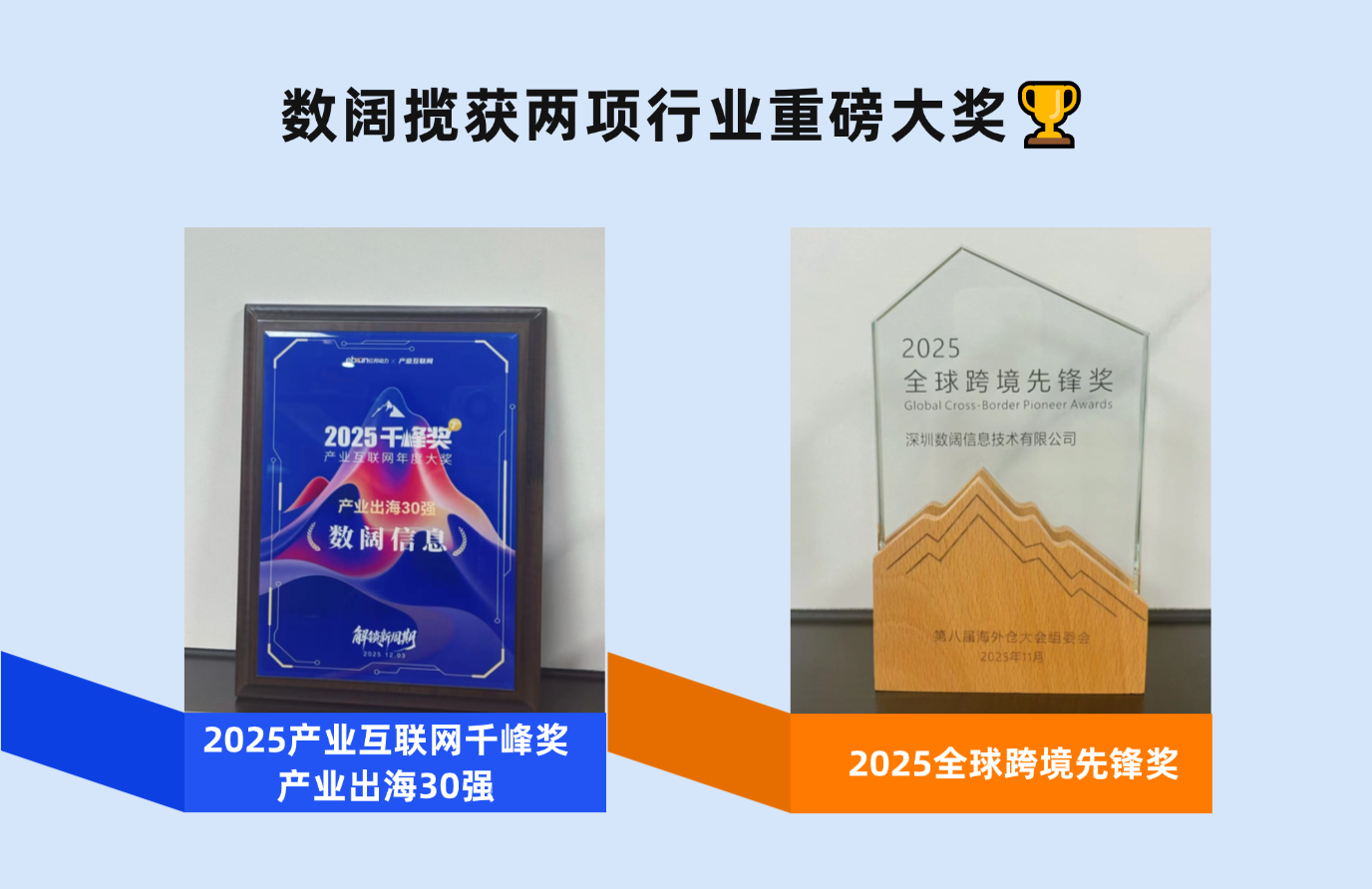 捷报频传!数阔凭借在产业出海与跨境服务领域的深耕积淀、创新实践,近期在两大行业权威评选中斩获殊荣——成功入选「2025 产业互联网千峰奖-产业出海30强」,同时荣获「2025全球跨境先锋奖」