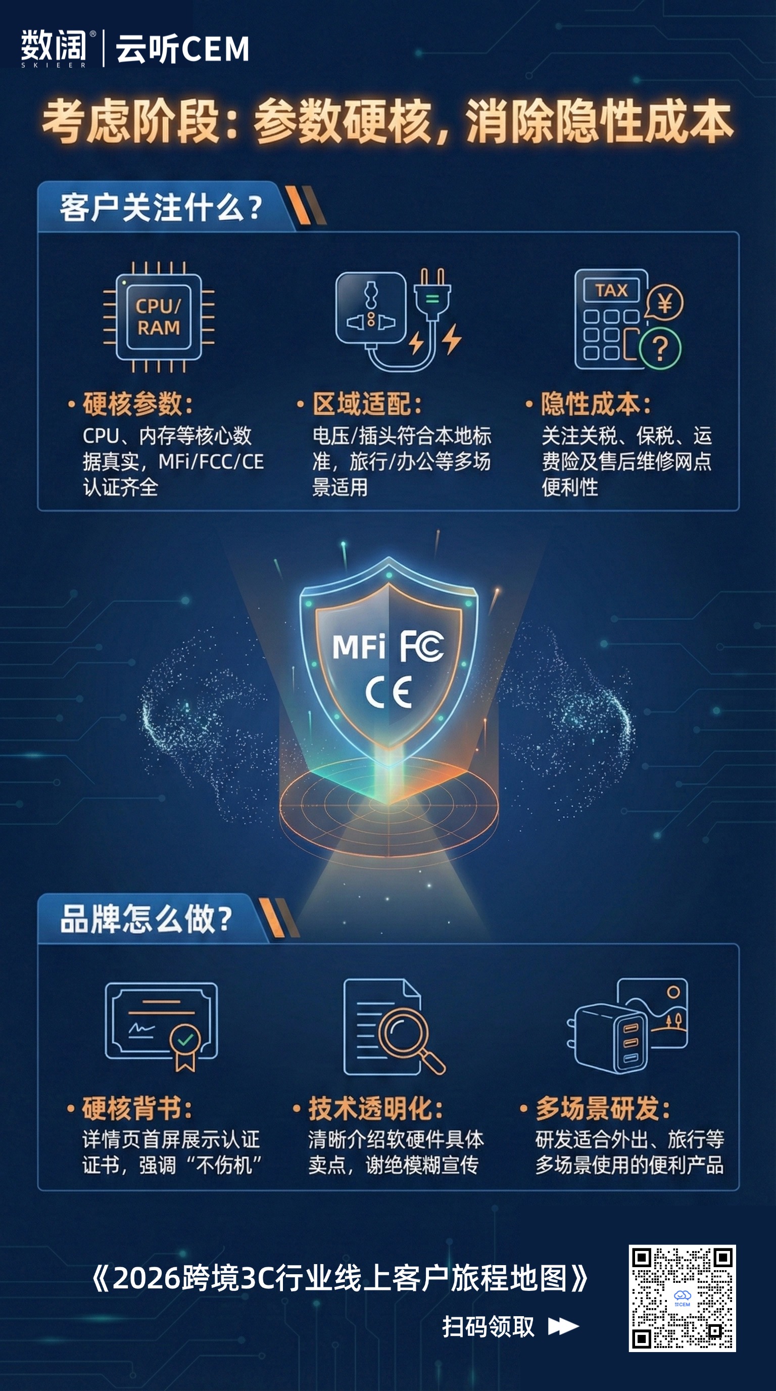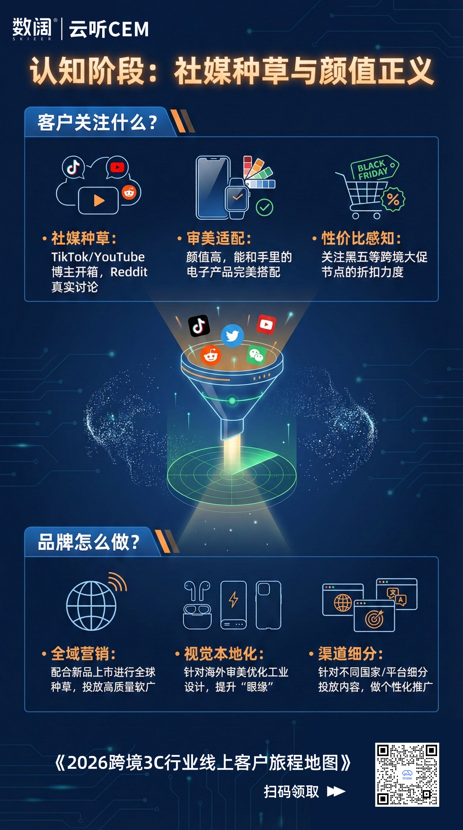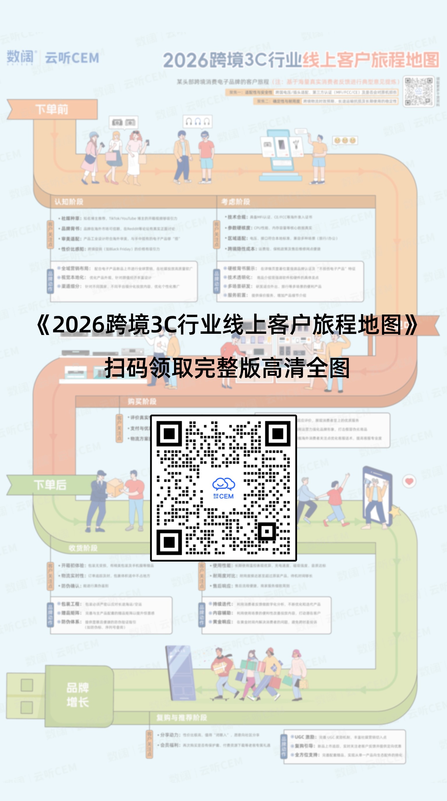 数阔云听CEM基于行业深度实战,为跨境3C卖家梳理出《2026跨境3C行业线上客户旅程地图》!